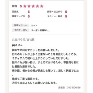 皆さま、こんにちは!大阪府大阪狭山市にある美容室「chacha Blanc(チャチャブラン)」のスタッフです。先日、お客様から大変嬉しい口コミをいただきました!ありがとうございます!これからも、皆さまに快適な時間を過ごしていただけるよう、技術やサービスの向上に努めてまいります♪